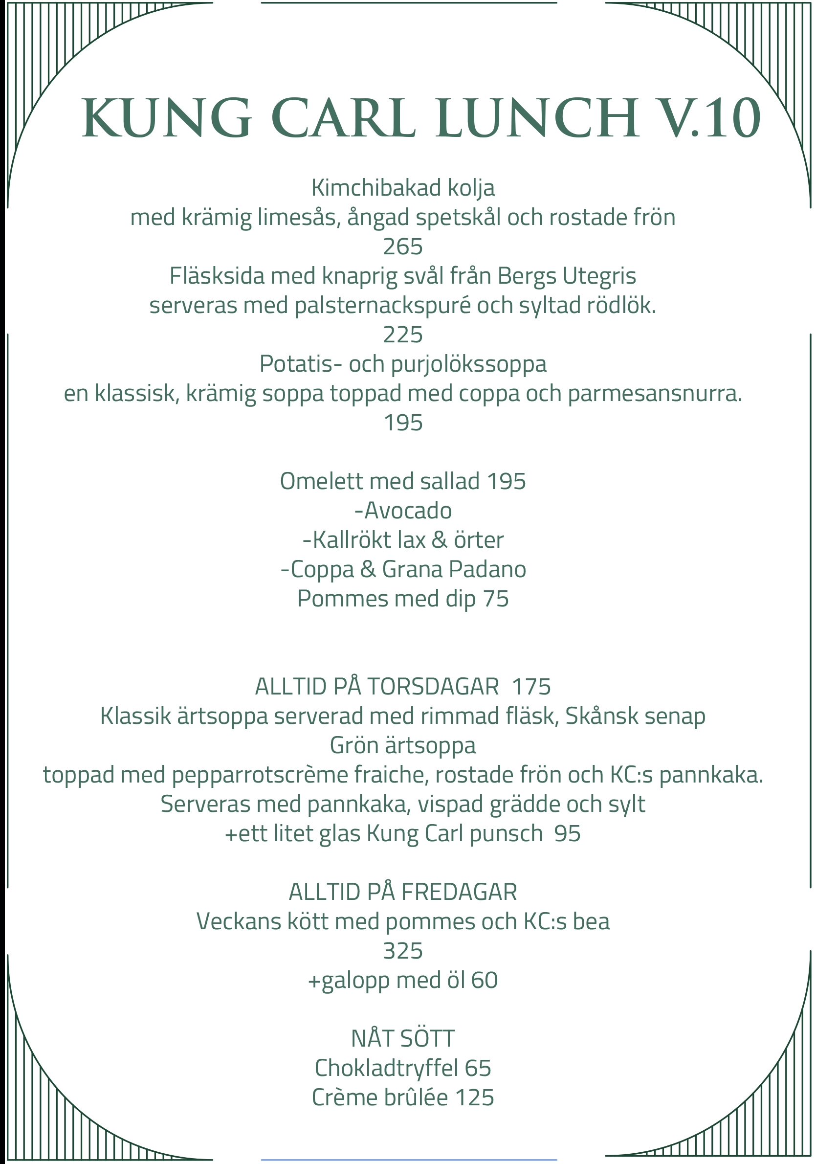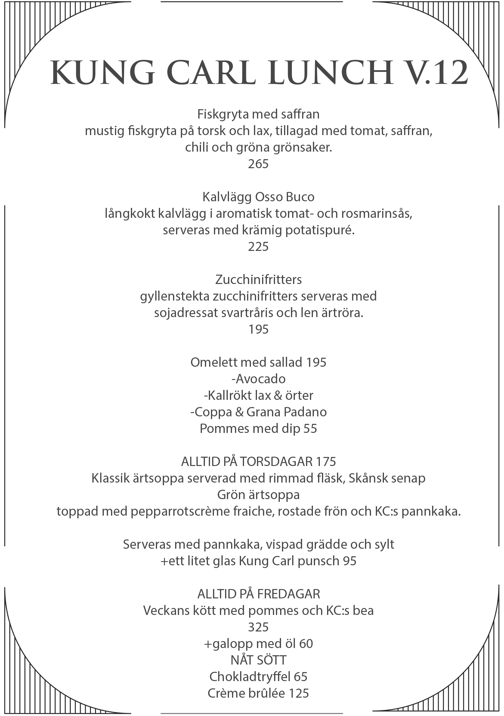 Avnjut en trevlig lunch i god atmosfär på Hotel Kung Carl. Vår lunchmeny uppdateras dessutom veckovis så att du alltid har nyheter att se fram emot.