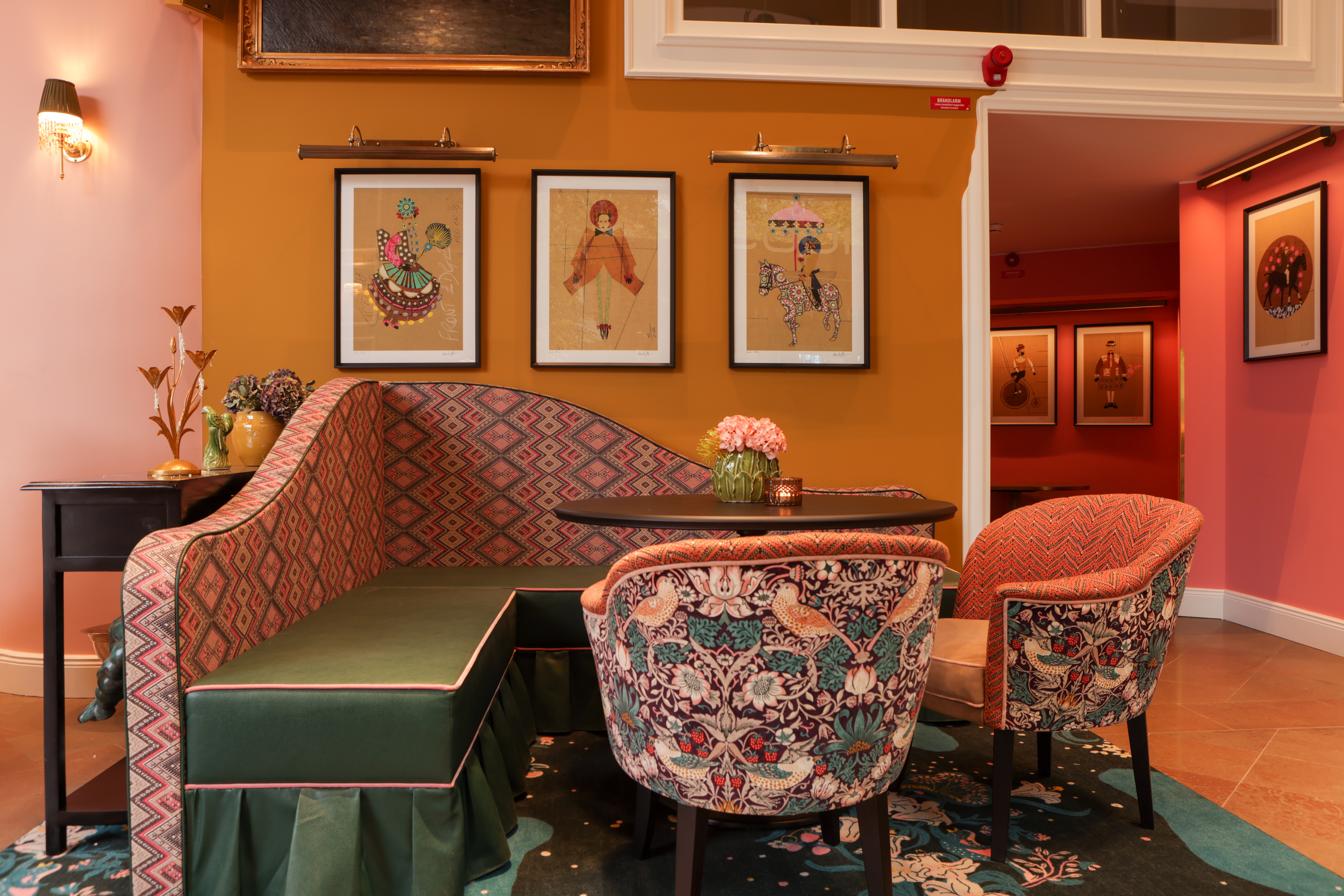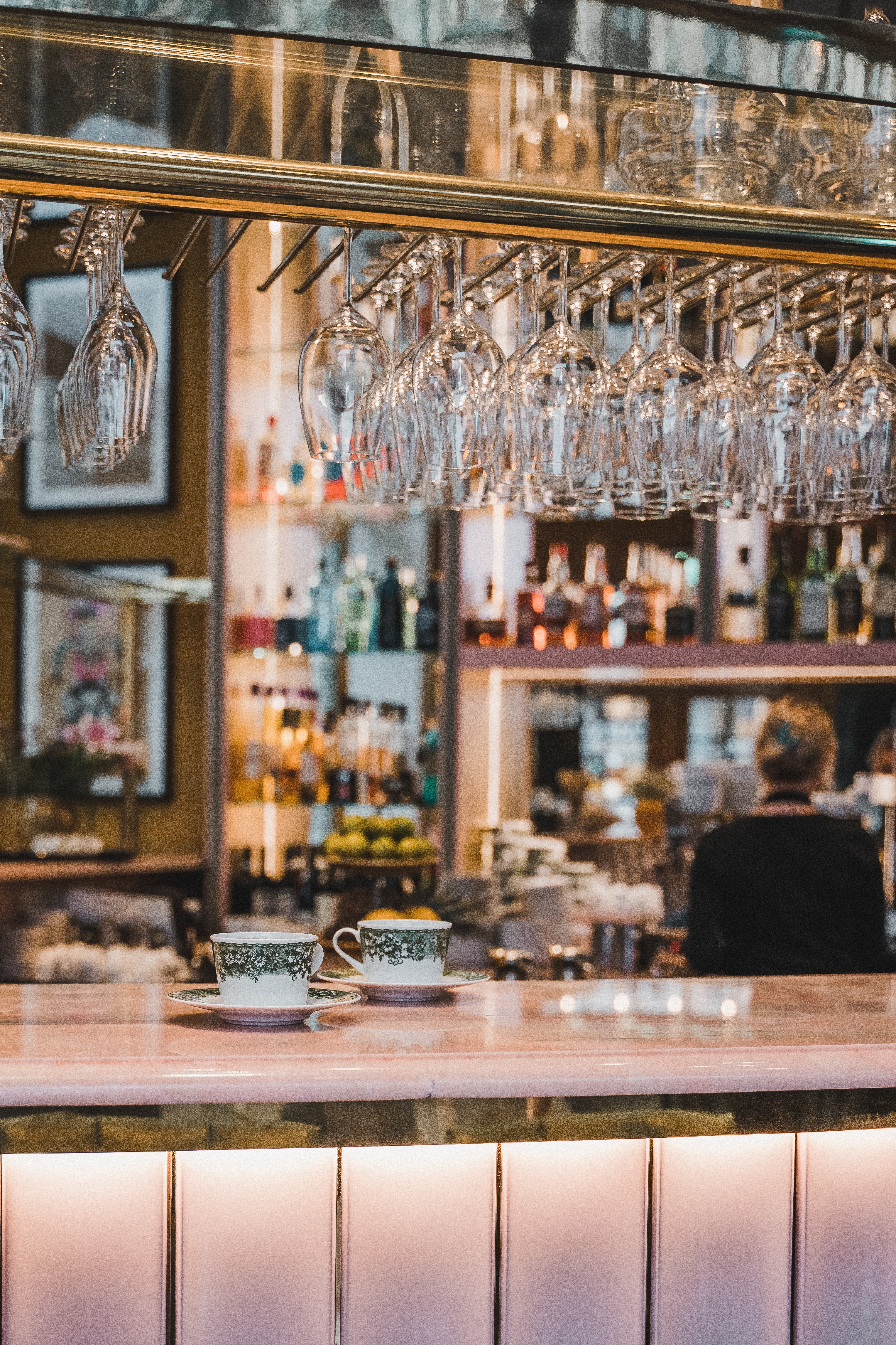 Slå er ner vid ert bord i den ljusa lokalen med känsla av Paris – inredd med rosa marmor, sirliga blommönster och panoramafönster ut mot Stureplan och folkvimlet.